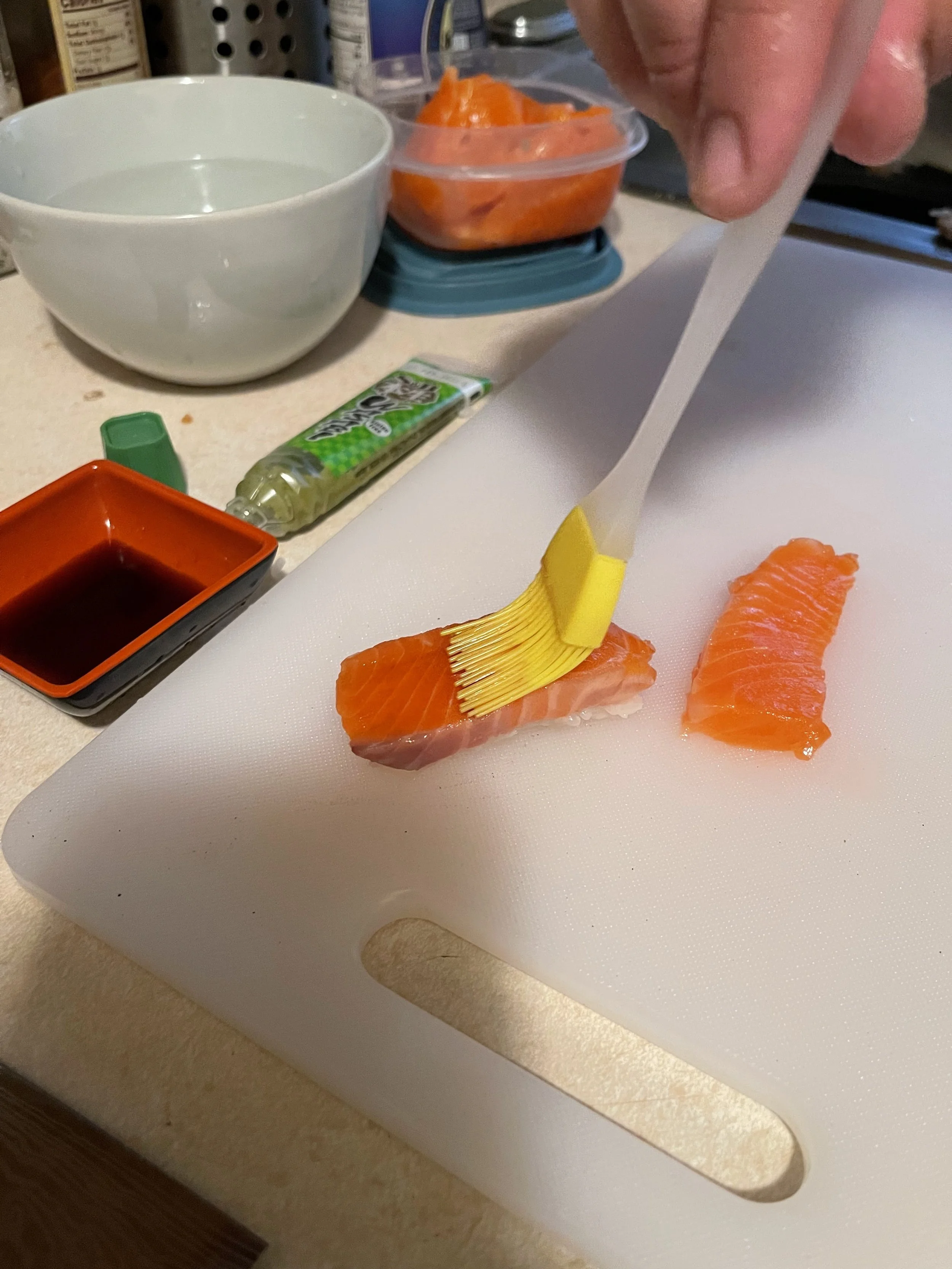 With the rice done, its time to make some sushi! I started off with the Nigiri, and used the instructions in the" “Sushi Master” book, which actually proved quite helpful because of the pictures for every step of the process. I will say however that there was one point of confusion pertaining to the application of the wasabi. I managed to work it out in the end however, and this is how that process looks like. Although it doesn’t say to brush it with soy sauce in the “Sushi Master” book, it is something i saw in the “Jiro Dreams of Sushi” documentary and so decided to add it here. Nigiri is meant to be eaten as soon as it is prepared and proper etiquette holds that you NOT separate the fish from the rice nor dunk it in the soy sauce as doing so disrupts the balance of flavors the chef has crafted. As an aside I would like to note that true wasabi is really hard to get in the states and most of what you find is mostly horse radish, however this “hon wasabi” we are using claims to be more parts wasabi than horse radish. https://youtube.com/shorts/H0y8MuWPyCY?feature=share